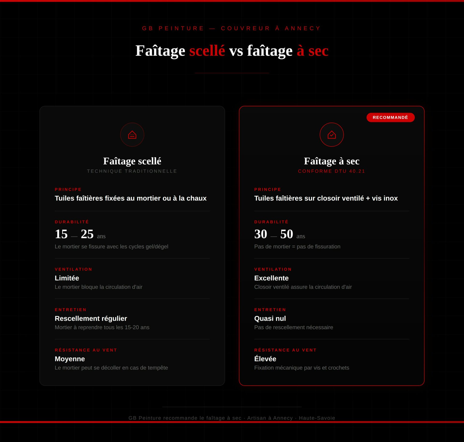 Le faîtage à sec avec closoir ventilé est aujourd'hui la solution la plus durable et la plus performante. Il assure une meilleure ventilation, résiste mieux au vent et ne se fissure pas comme le mortier. GB Peinture le recommande systématiquement en réfection.